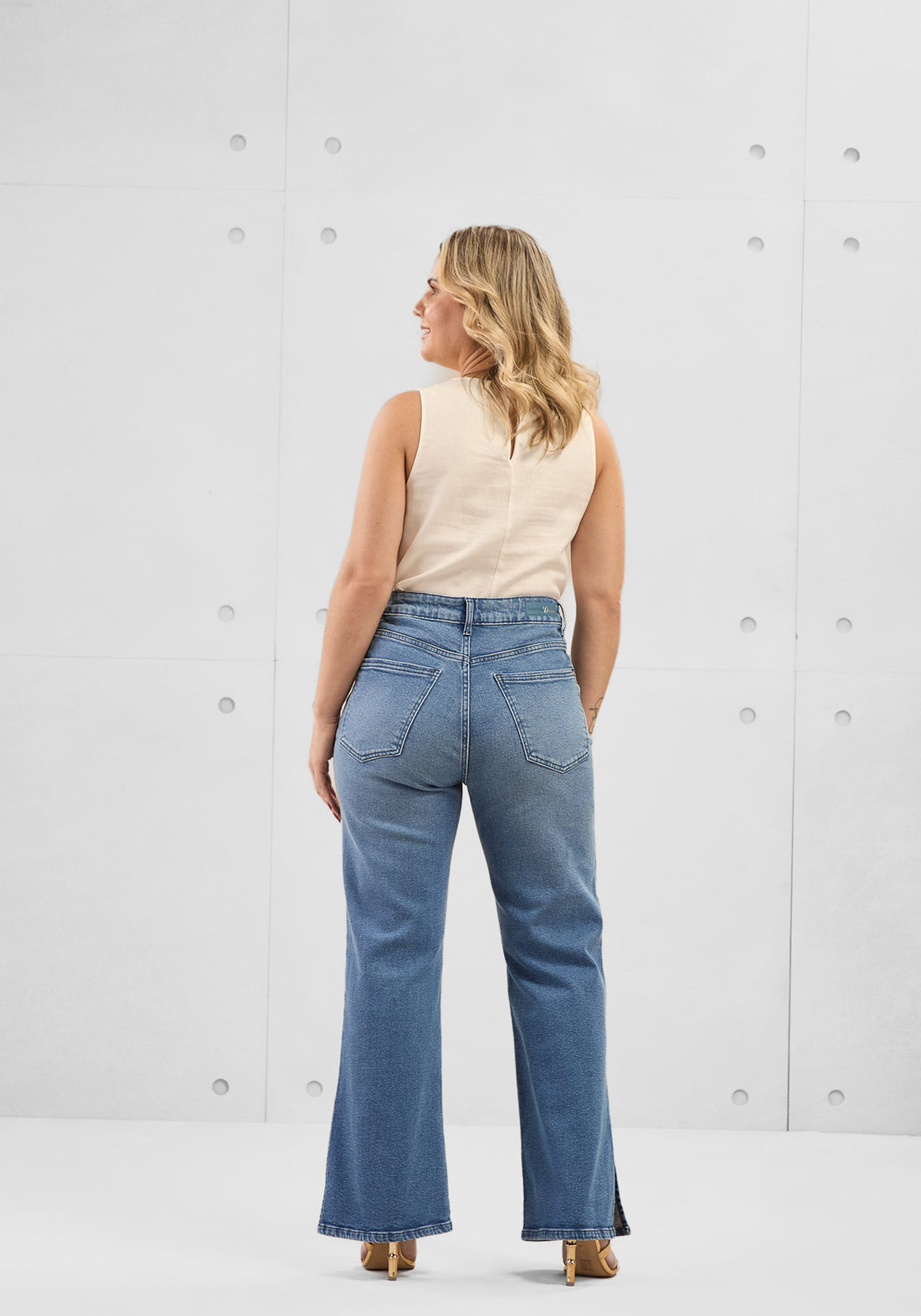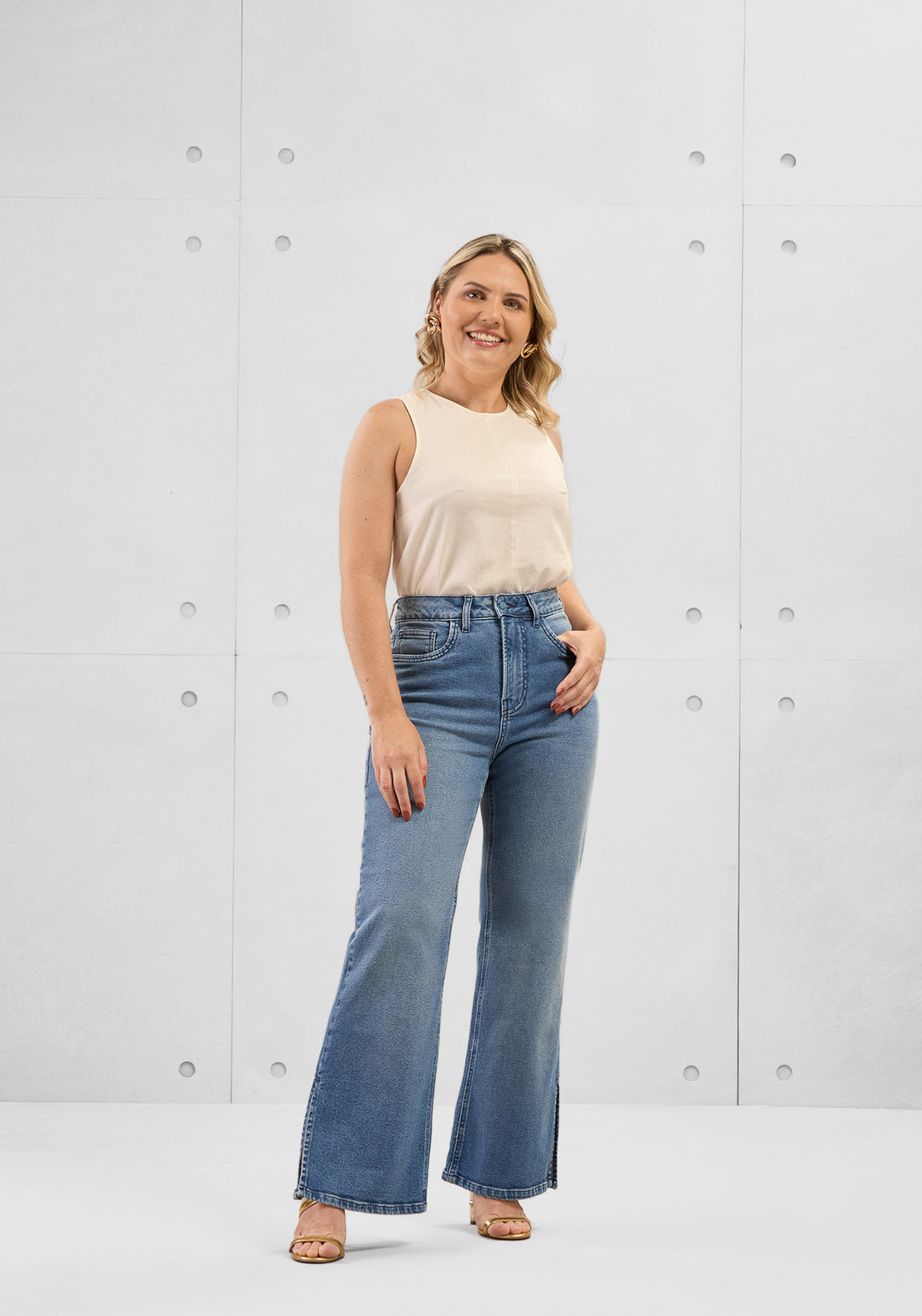 AdicionarCalça Jeans Lunender Mulheres Baixa Wide Leg Chapa Barriga Elastano com Bolso Azul Claro