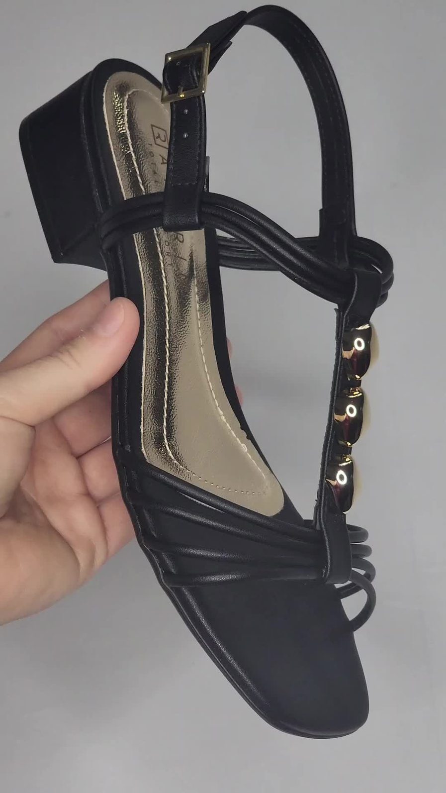 AdicionarSandália Ramarim Bico Quadrado Tira Aplicação Metal Fechamento Fivelo Salto Rasteira Preto