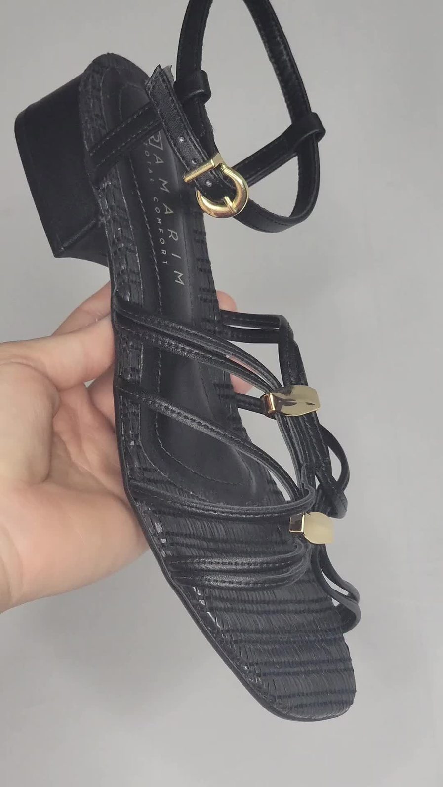 AdicionarSandália Ramarim Bico Quadrado Tiras Vazada Aplicação Metal Palmilha Tressê Fechamento Fivela Salto