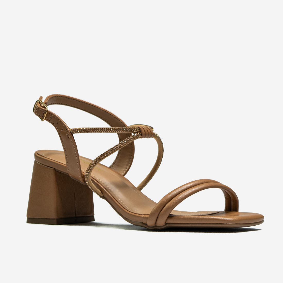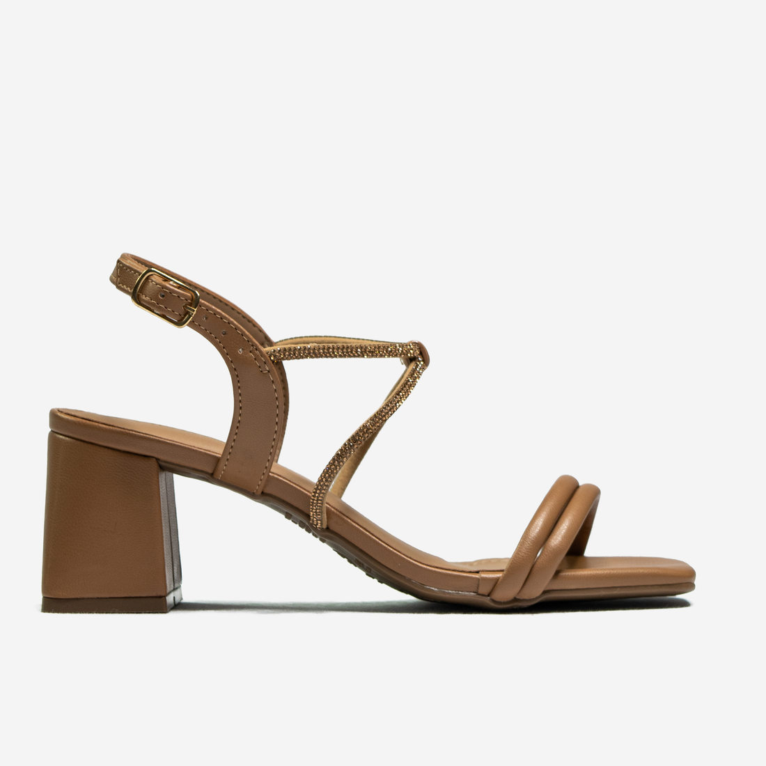 AdicionarSandália Via Marte Bico Quadrado com Tiras Strass Nó Salto Baixo Fechamento Fivela Bege