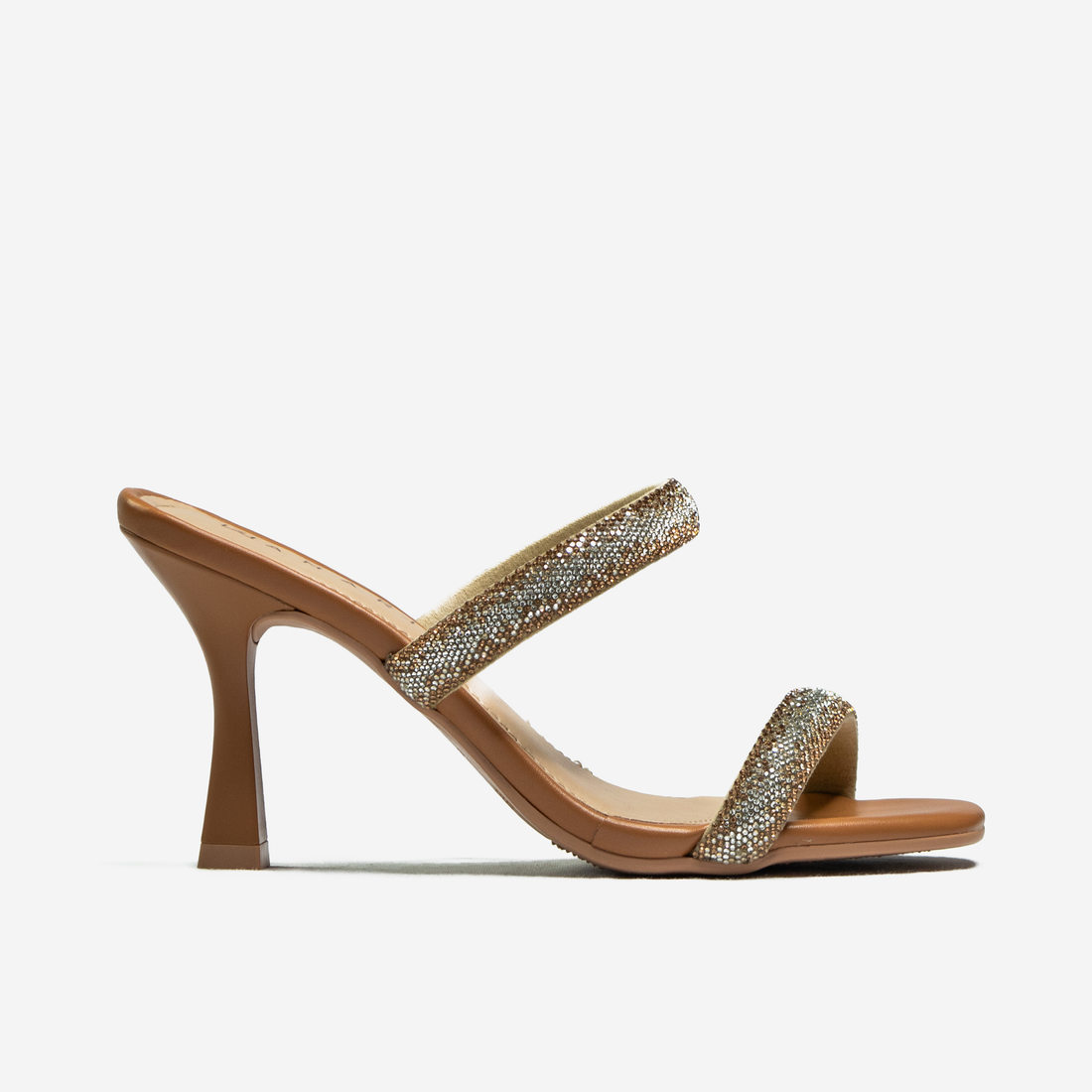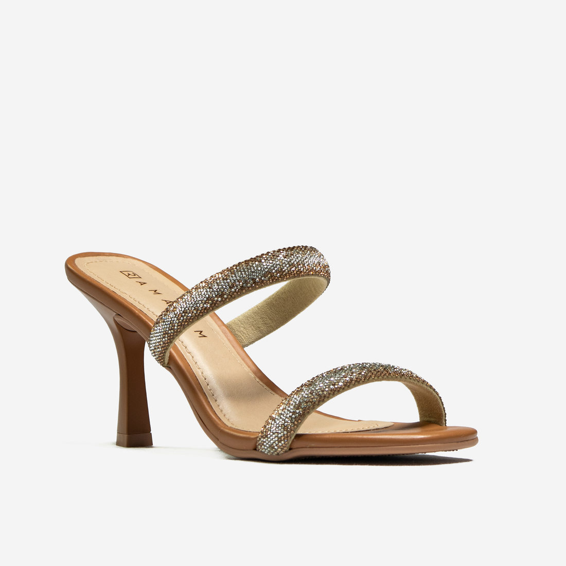 AdicionarTamanco Ramarim Bico Quadrado Tiras Strass Salto Baixo Fino Caramelo