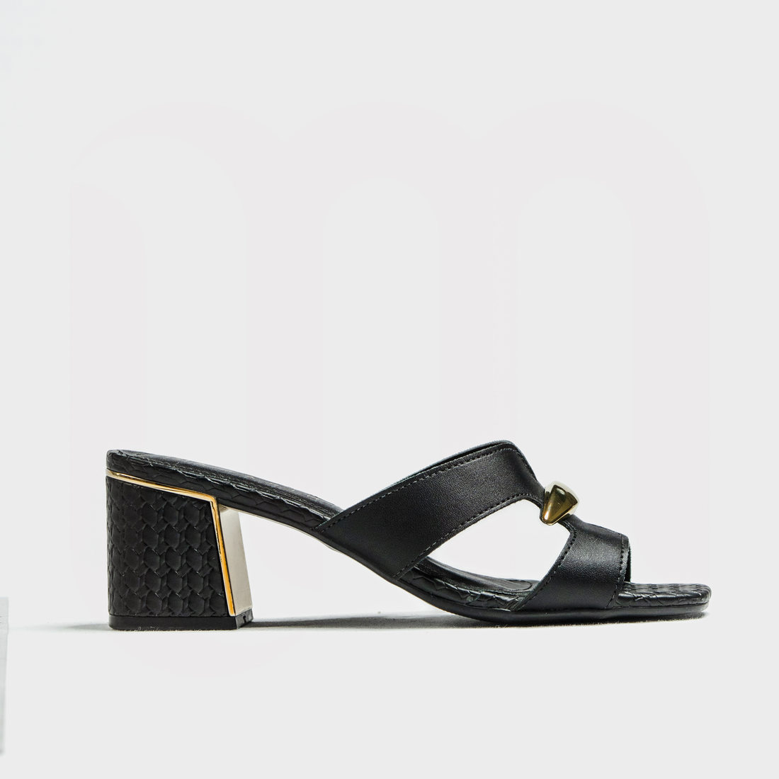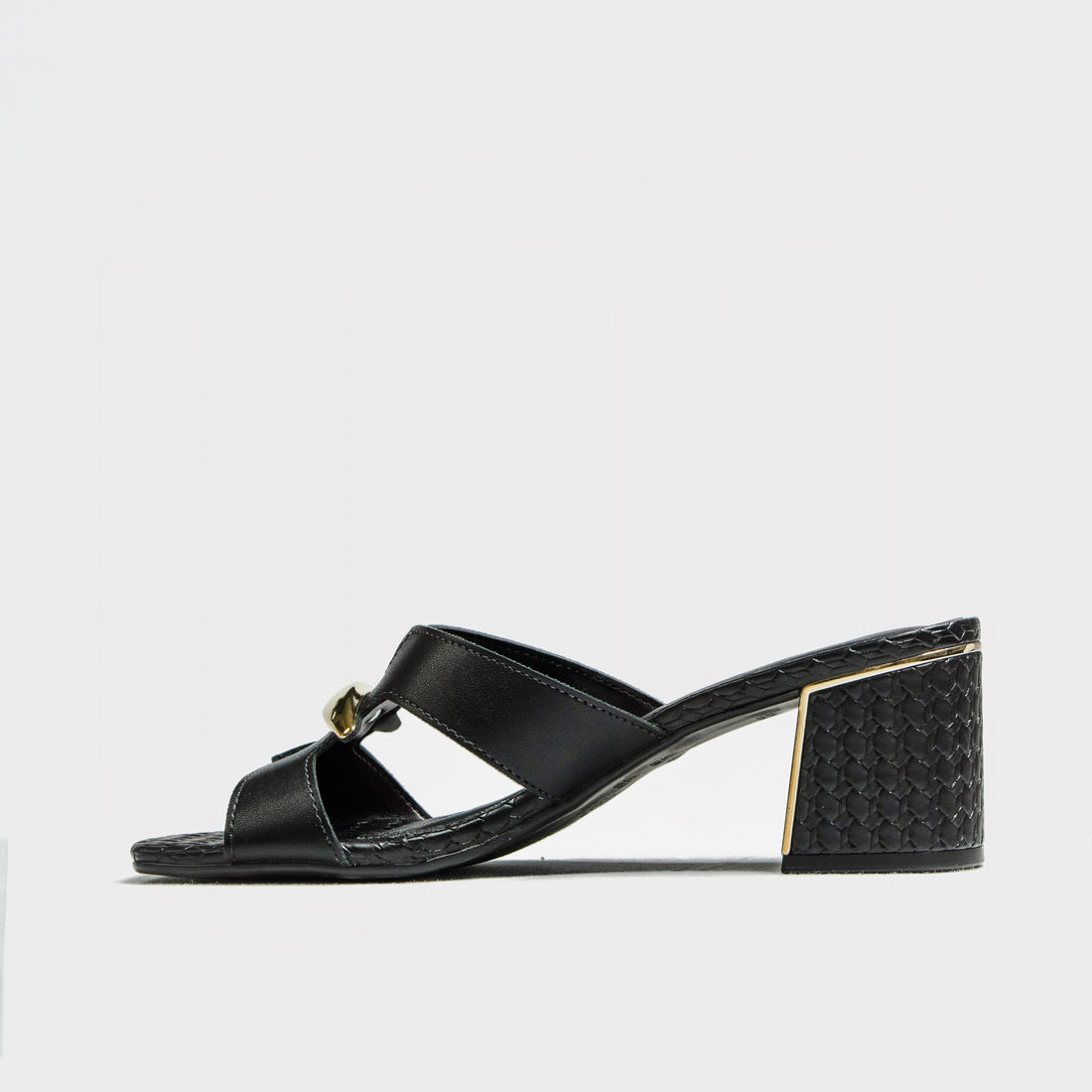 AdicionarTamanco Ramarim Cabedal Tira Geométrico Salto Baixo Texturizado Detalhe Metal Preto